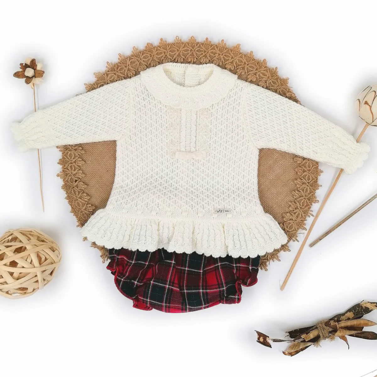 – Diseño : jersey con lazo y tira de puntilla y cubre pañal a cuadros escoces .