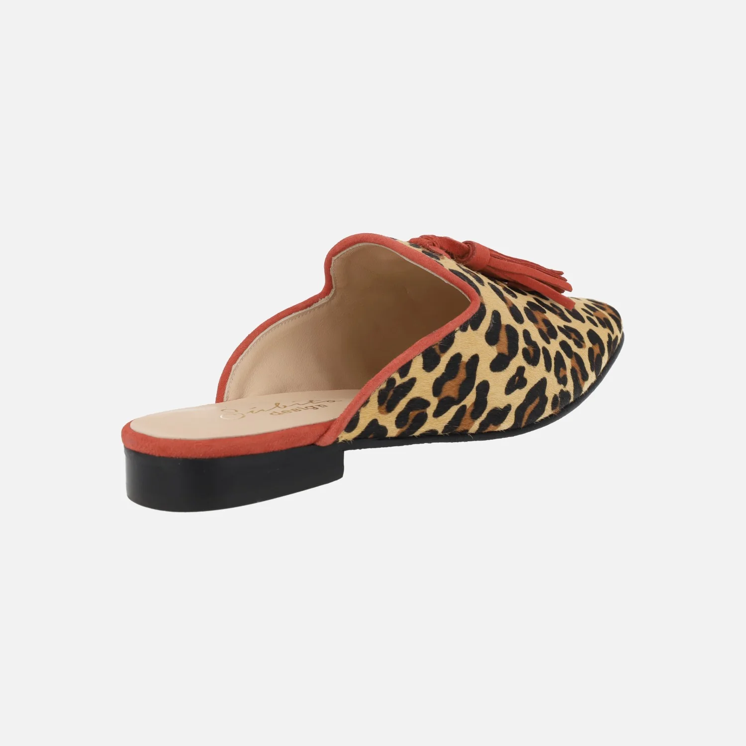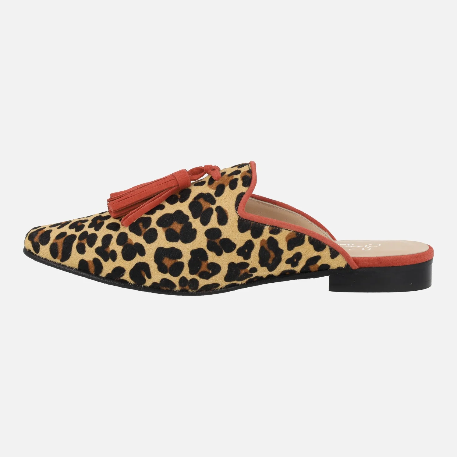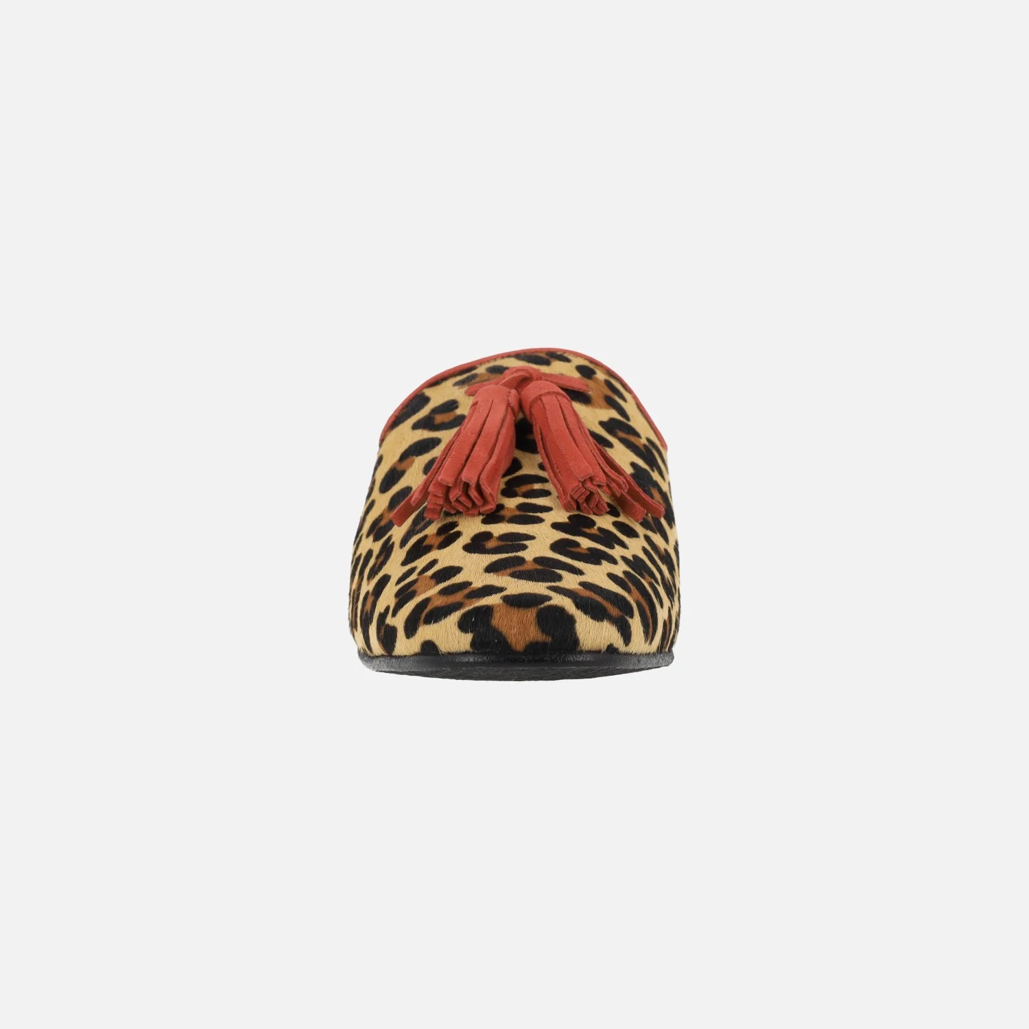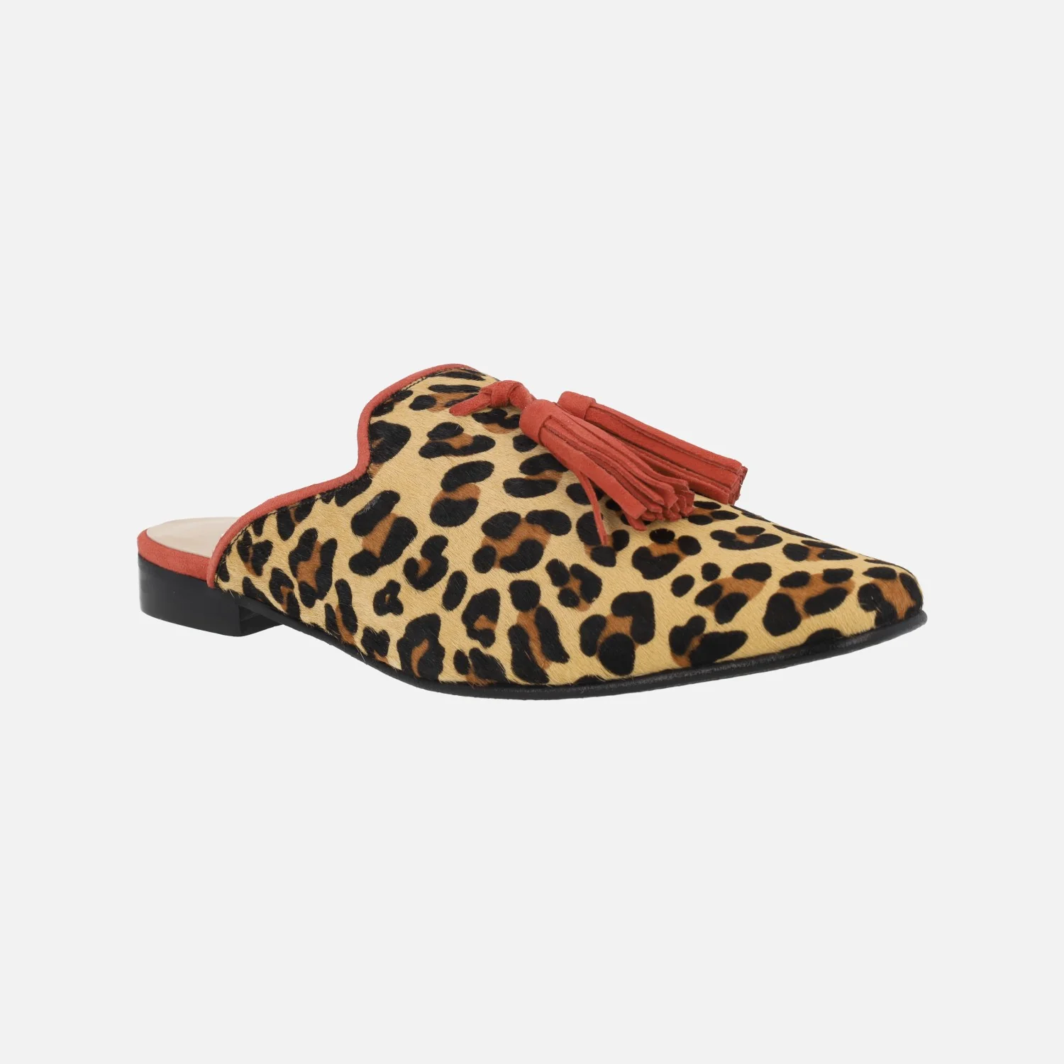 Zuecos de piel print leopardo para mujer de la marca Mirai, modelo s-4013. Zuecos mules elaborados en piel estampada leopardo, con detalle de ribete y borlas de ante en rojo. Interiores forrados de piel. Piso sint茅tico con 2 cm de tac贸n.