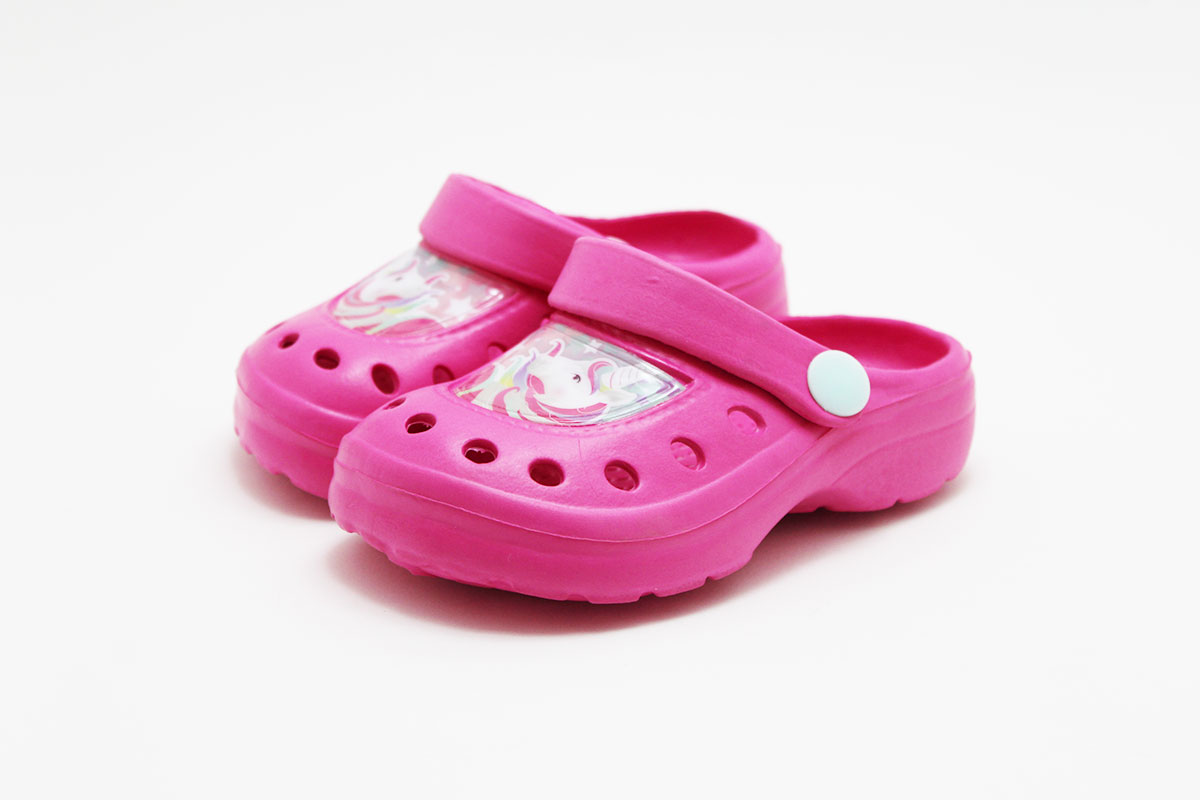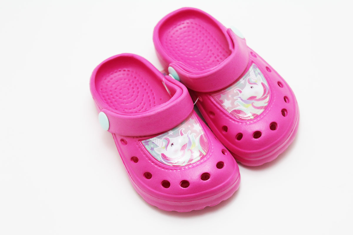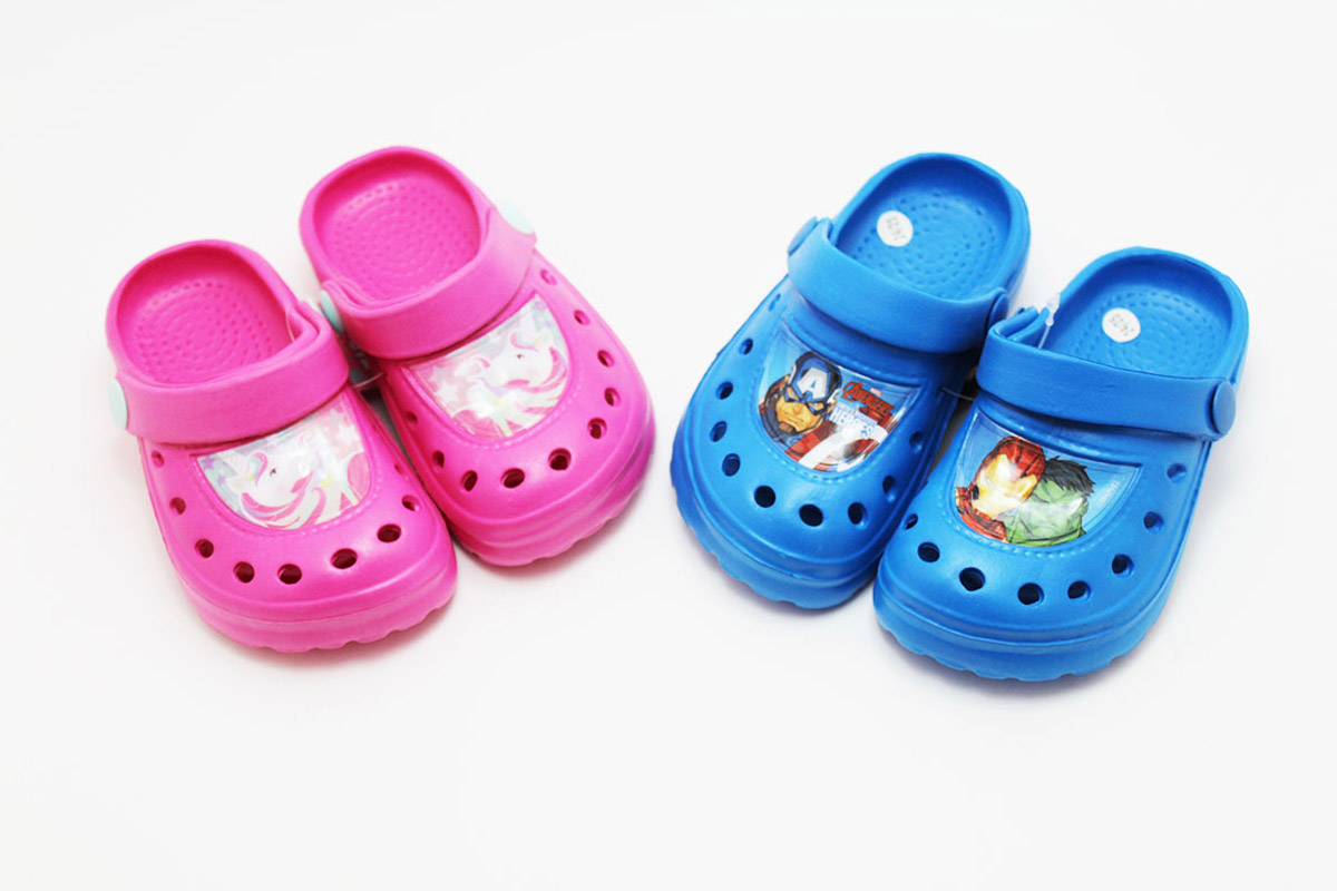 Zuecos para ir a la playa y piscina de PVC. Son super fáciles de poner y quitar. Disponible en color azul con un diseño de superhéroes y en color rosa fuxia con un diseño de unicornio.