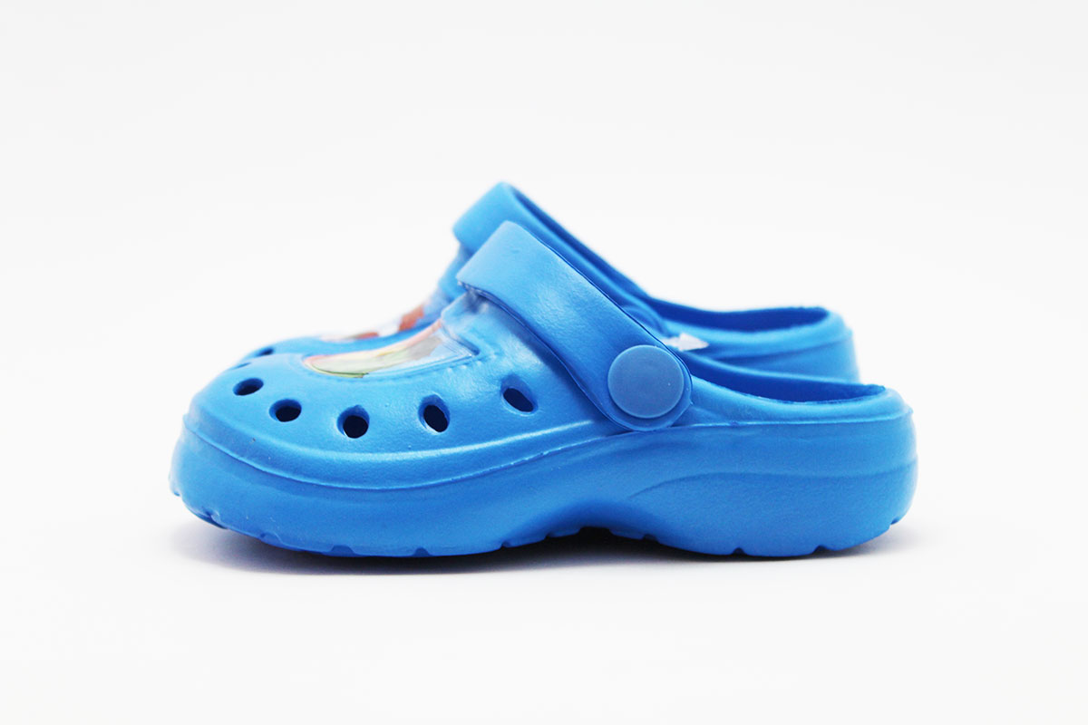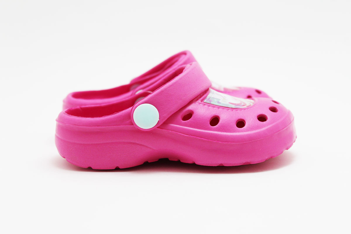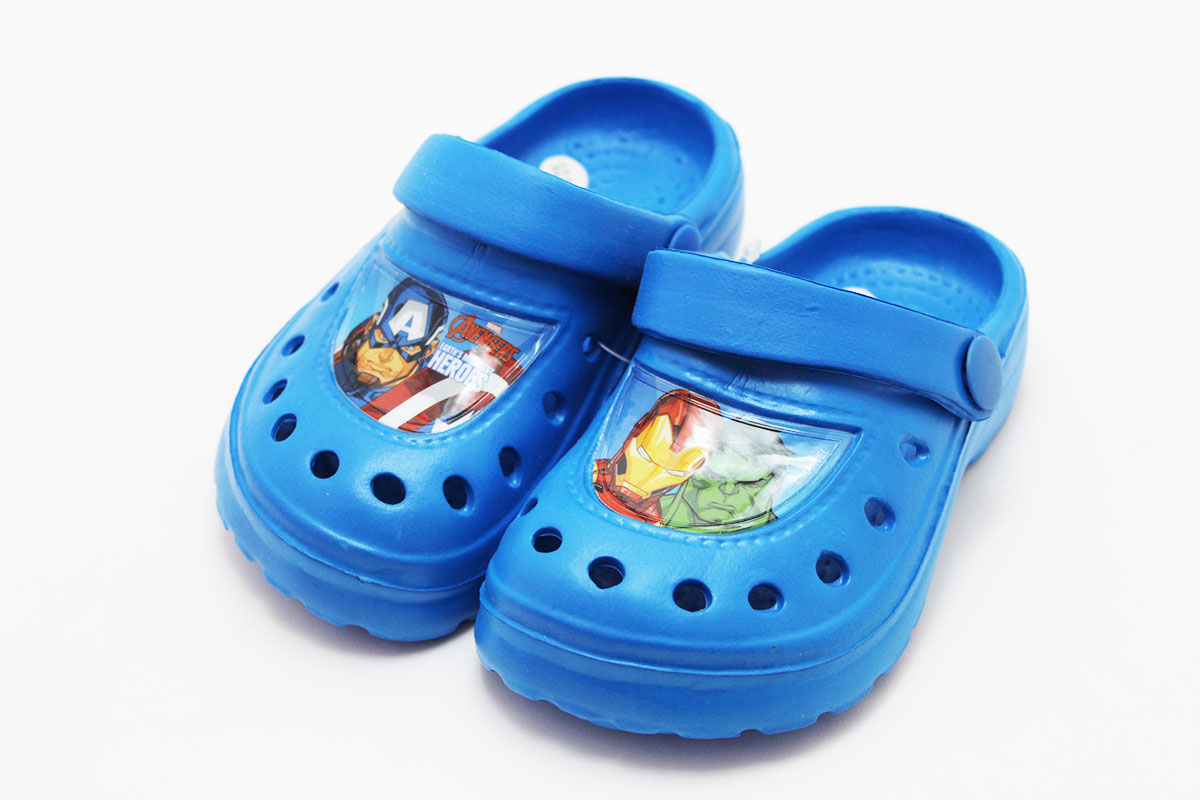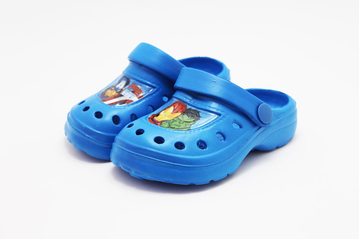 Zuecos para ir a la playa y piscina de PVC. Son super fáciles de poner y quitar. Disponible en color azul con un diseño de superhéroes y en color rosa fuxia con un diseño de unicornio.