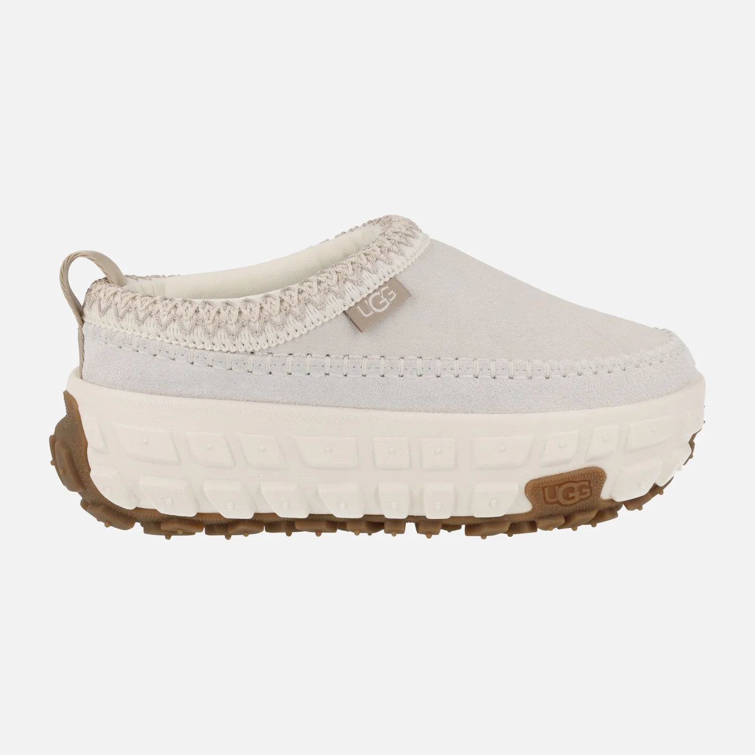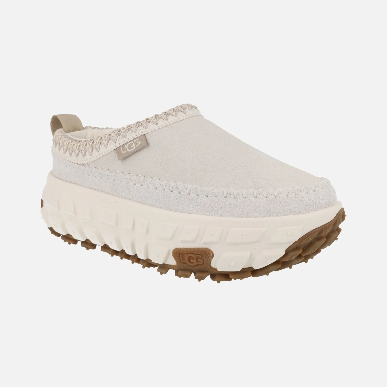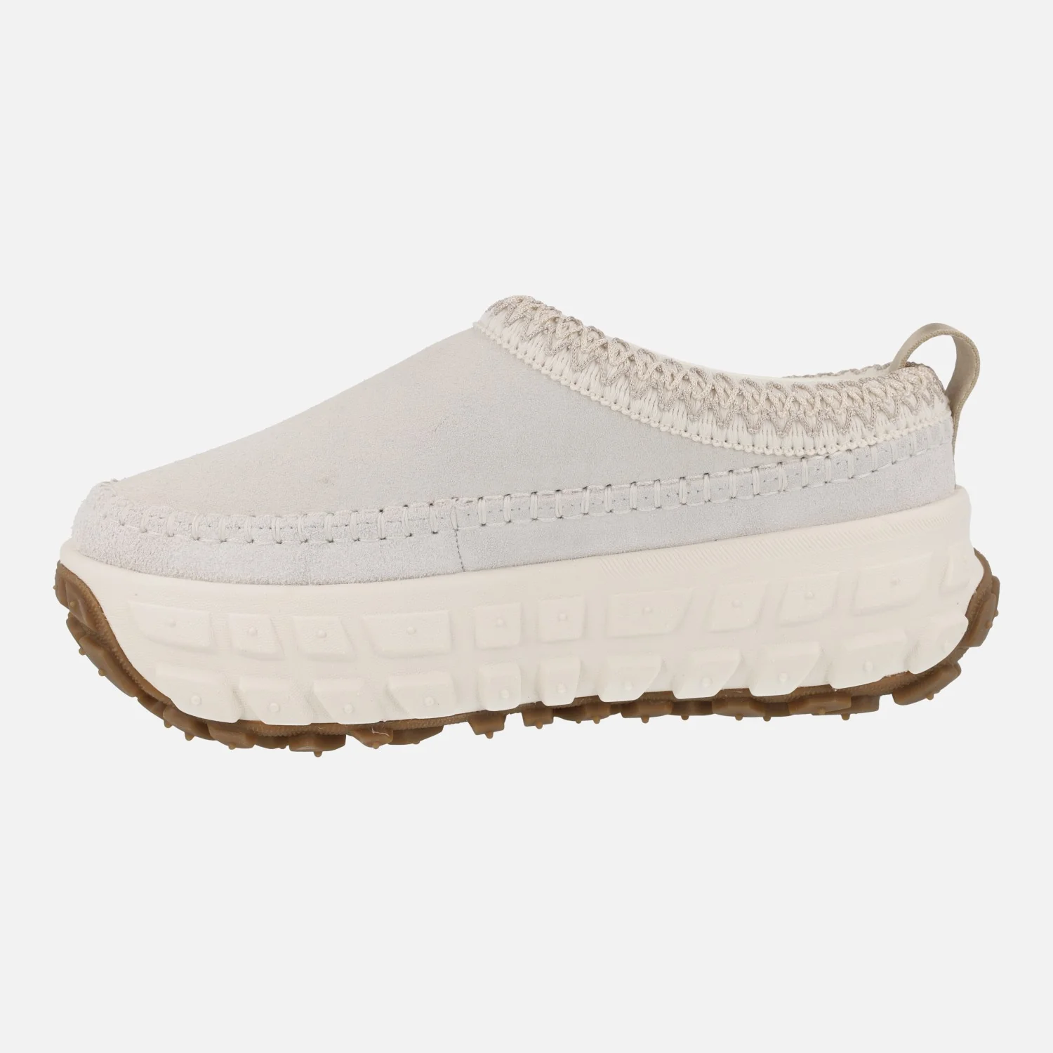 Zuecos de la marca Ugg modelo1155650 Ventura Daze Jasmine. Elaborados con parte superior en ante acolchado color blanco roto, detalle de tira textil bordada en distintos tonos de beige. Tirador trasero. Forro interior en tejido acolchado, planta de EVA de ca帽a de az煤car, no extra铆ble. Plataforma de EVA, con una altura aproximada de 5 cms. Suela de caucho.