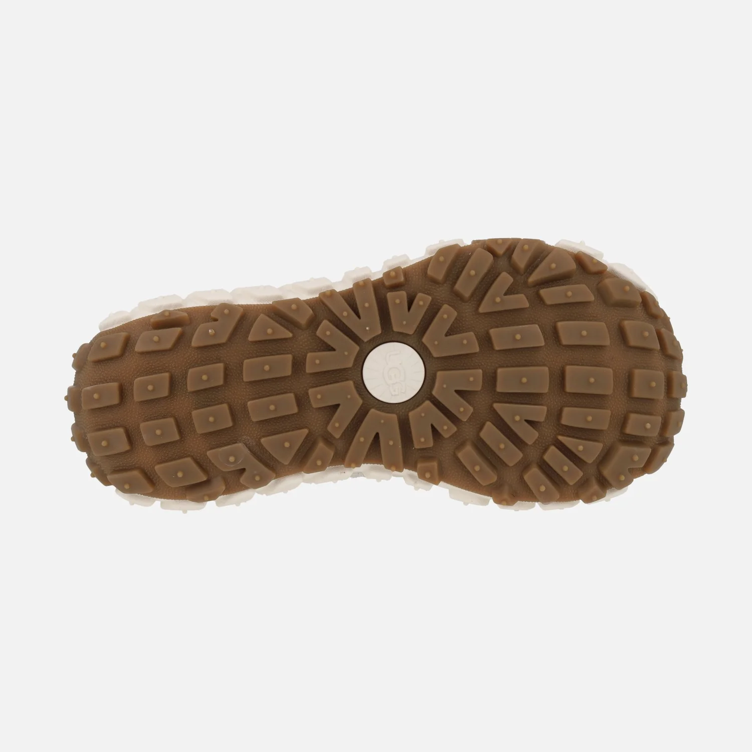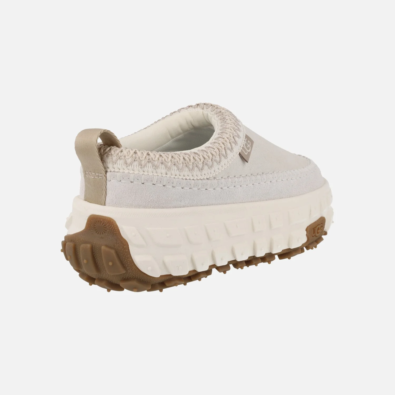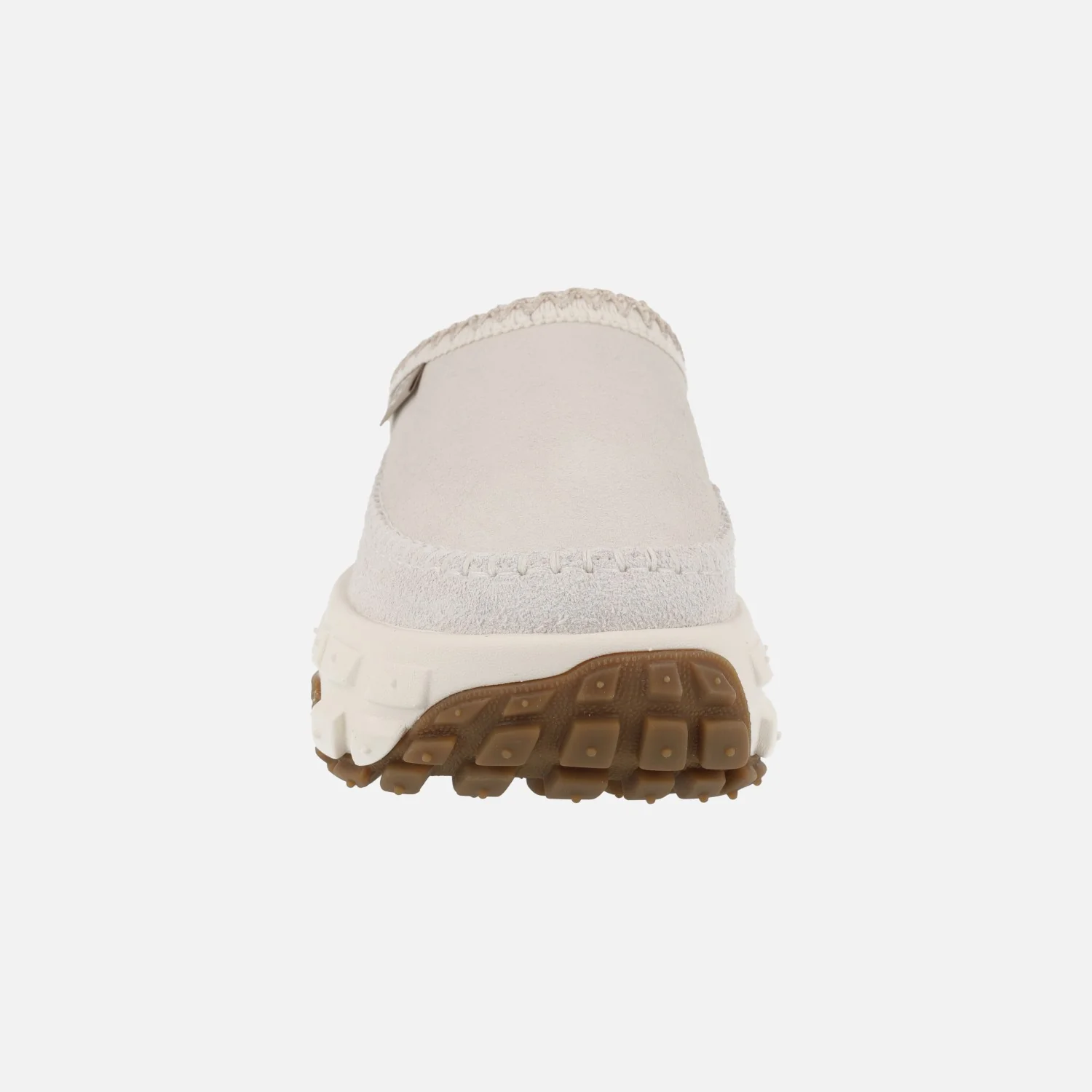 Zuecos de la marca Ugg modelo1155650 Ventura Daze Jasmine. Elaborados con parte superior en ante acolchado color blanco roto, detalle de tira textil bordada en distintos tonos de beige. Tirador trasero. Forro interior en tejido acolchado, planta de EVA de ca帽a de az煤car, no extra铆ble. Plataforma de EVA, con una altura aproximada de 5 cms. Suela de caucho.